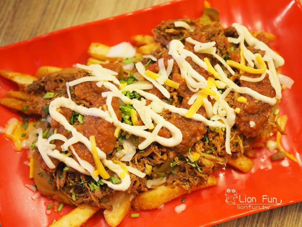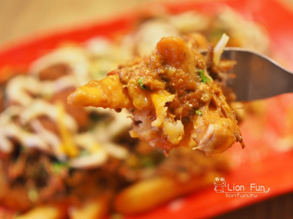 第一次看到那麼大份的薯條,裡面有豬肉絲、墨西哥醬汁、酸豆、起司、莎莎醬等等