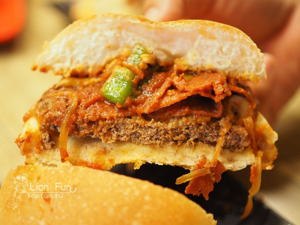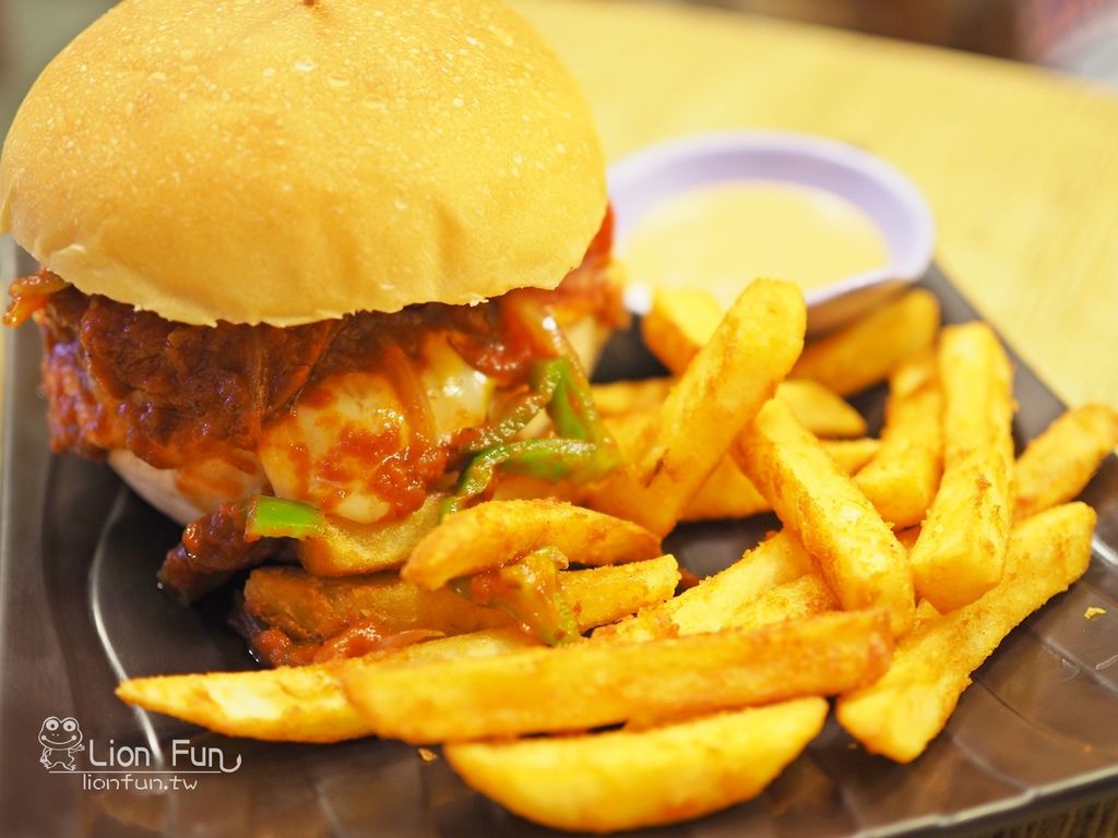 比較常見的漢堡,但內餡是以披薩的做法,另外附薯條