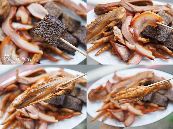 燻茶鵝、油雞、百頁豆腐、米血、黑輪片、豬頭皮、鴨翅、鴨腳、雞腳