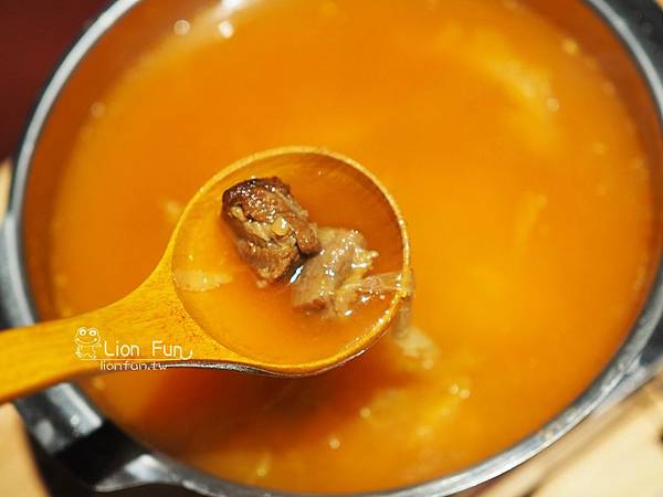 湯頭是用牛肉與泡菜一起熬煮出來的,直皆可以吃到牛肉塊