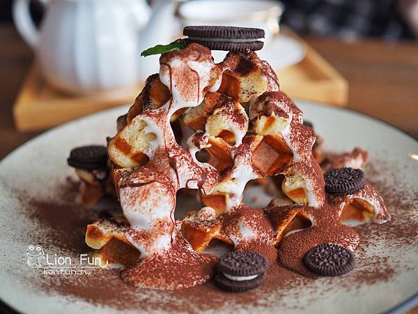 不是一貫式的圓鬆餅,而是一塊塊的脆鬆餅,灑滿著可可粉