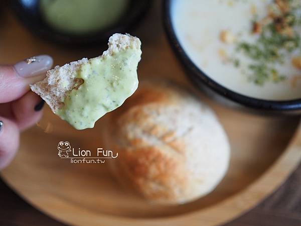 麵包沾的是葉子的特製青醬,味道不會很膩口,不像美乃滋一樣