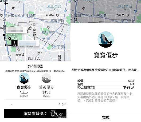 把路線規畫好後可以看到價格,當天使用的時候有Uber 寶寶優步與精英優步可以選擇