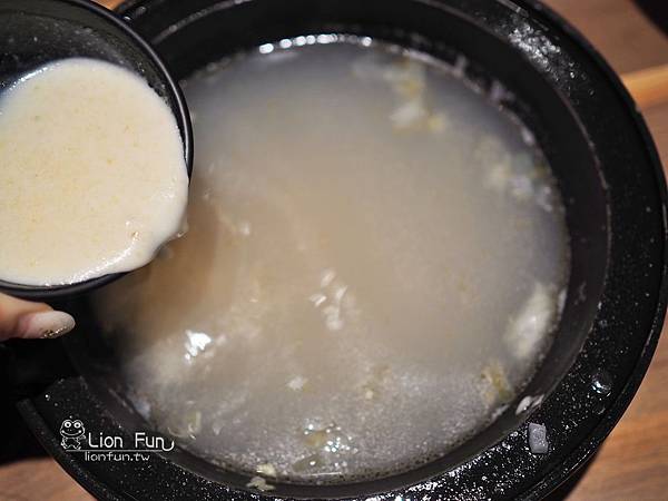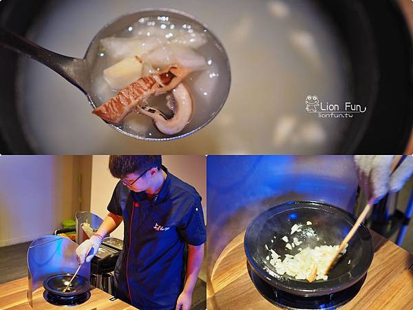 上老石鍋最大特色在於它的湯頭,先用自製的麻油加魷魚、洋蔥、大蒜下去拌炒