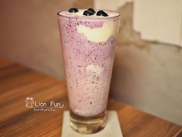 新鮮藍莓打成冰沙,加入優格,味道不甜微酸