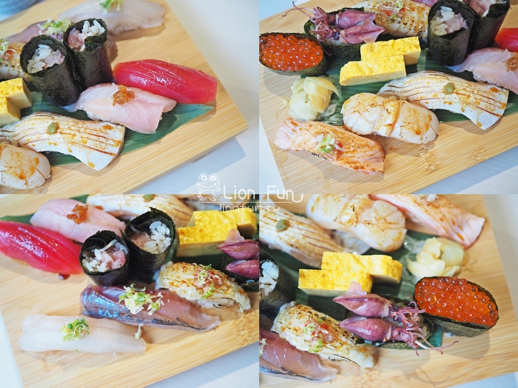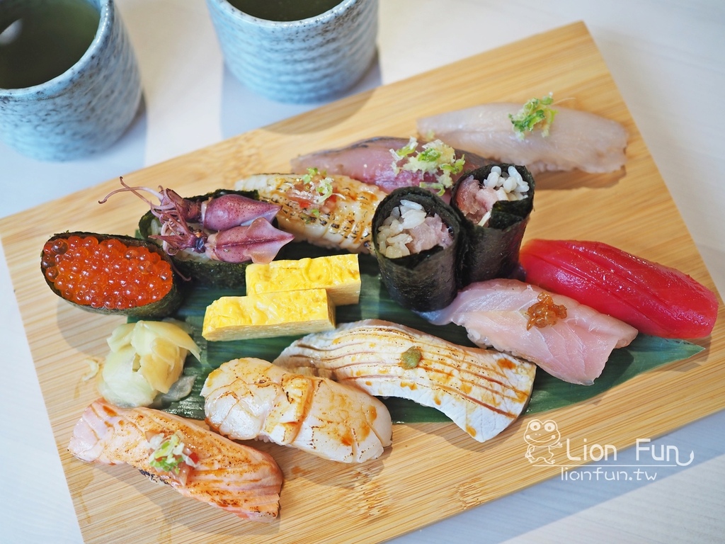 鮭魚卵、螢烏賊、比目魚、竹莢魚、青旗、炙燒鮭魚、炙燒干貝、炙燒旗魚肚、旗魚、鮪魚、蔥花鮪魚