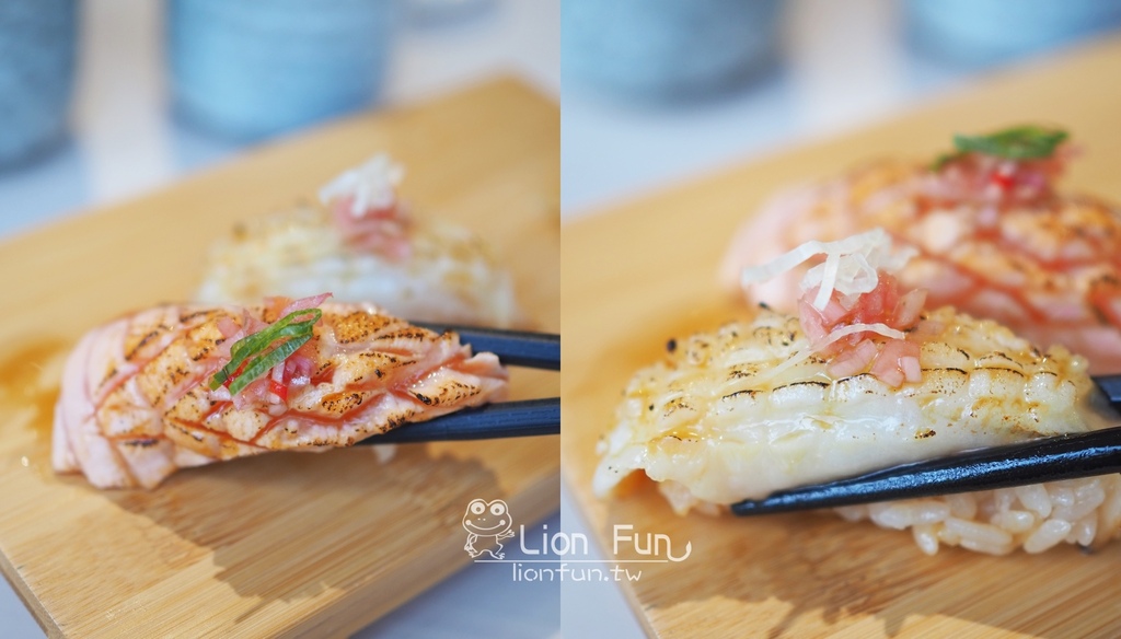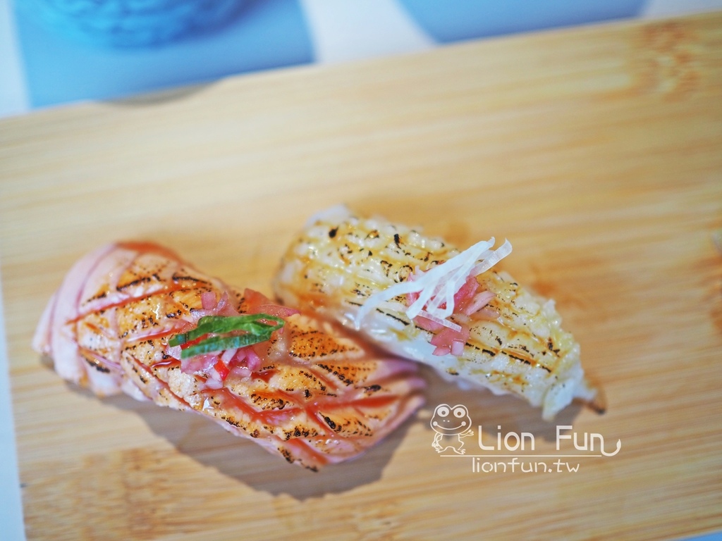 鮭魚炙燒壽司、比目魚側緣炙燒壽司