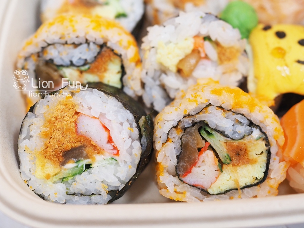 海苔捲壽司*3、蝦卵捲壽司*3、生食鮭魚手毬壽司*3、炙燒鮭魚手毬壽司*3、炙燒魚手毬壽司*2、微笑親子手毬壽司*2