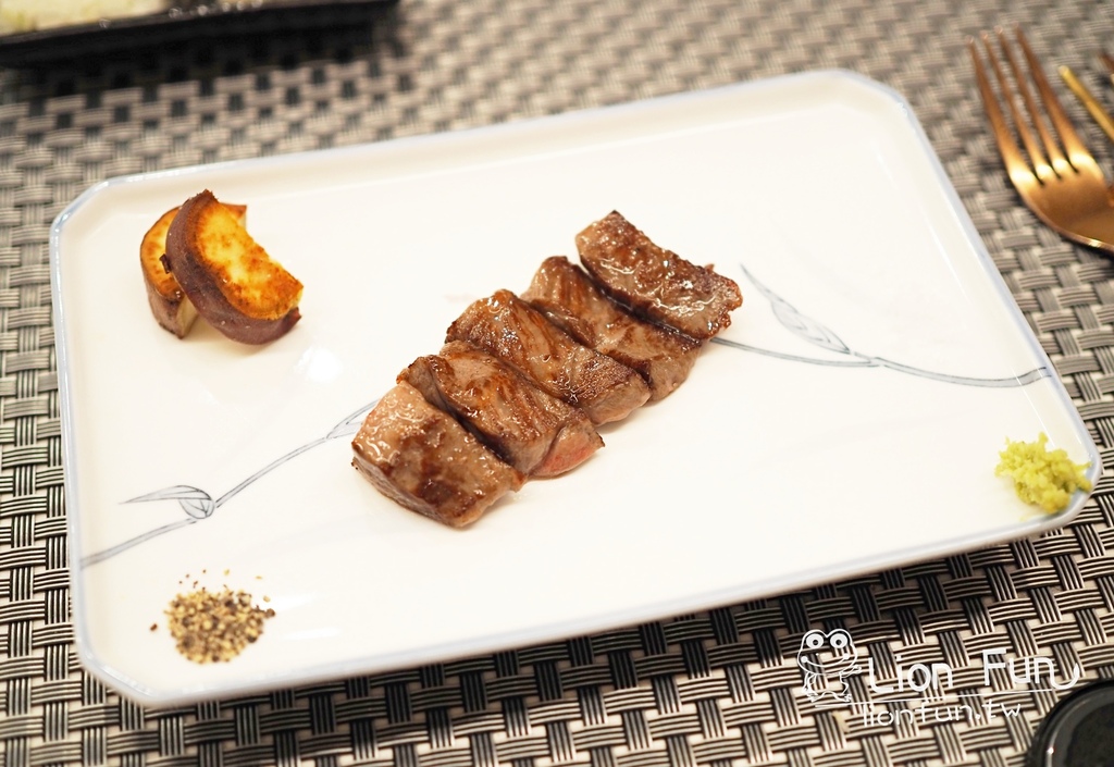 主廚考量到台灣某部分客人,較不習慣A5油花非常豐腴,高油花的柔嫩口感,可選擇油花略減,體驗更具肉感且外酥內嫩令人意外驚豔的A4和牛