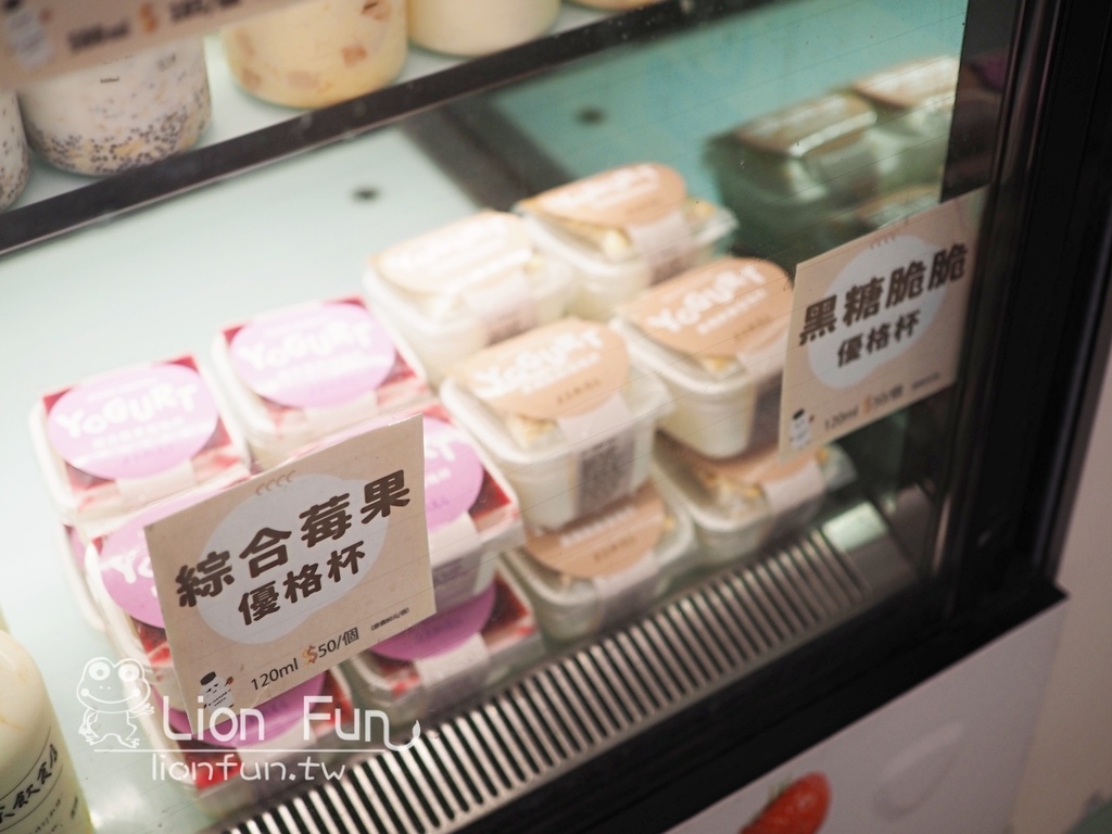 販售各種口味的優格飲,像是火龍果桂花蜜桑葚紅柚寒天奇亞籽燕麥鳳梨旺萊等等